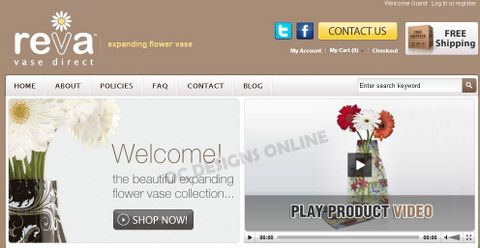 Next, we inserted a menu navigation bar where shoppers can learn more about Reva Vase Direct, their policy page, FAQs and with a Magento Go store design you can even have a blog! The mocha colored theme is placed throughout their Magento Go storefront and their Welcome Box encourages shoppers to “Shop Now” or watch an amazing video on how Reva Vases work—videos are another nice feature offered by Magento Go.