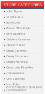 For the buyer who is not quite certain yet what type of toy or costume to choose, there is a vertical listing of store categories on the left side. Choose from categories that include action figures, “as seen on TV,” children’s costumes, clearance items and a wealth of brand name and licensed costumes.
