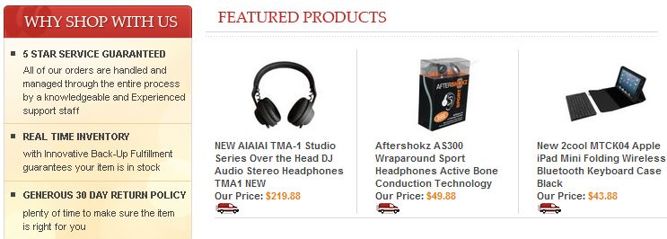 In the midsection, the store highlights featured products including new and discount merchandise to the right of a compelling “why shop with us” panel alerting shoppers to the company’s 5 star service guarantee, real time inventory and 30-day return policy.