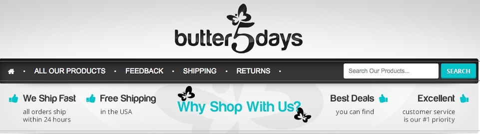 The header of this eBay shop design places the logo front and center. An image of a butterfly perches on the corner of the 5 in the store name. Customers will be sure to see the shop name in the bold, glistening font immediately. A charcoal grey information panel lies underneath the logo introducing online shoppers to main topics at butter5days. Customers can view all of the products at the store, review previous customer feedback and find shipping and return policies. Beneath the charcoal panel is a light grey panel. Here the store highlights reasons to shop at butter5days. Free and fast shipping along with great deals are only a few of the reasons!